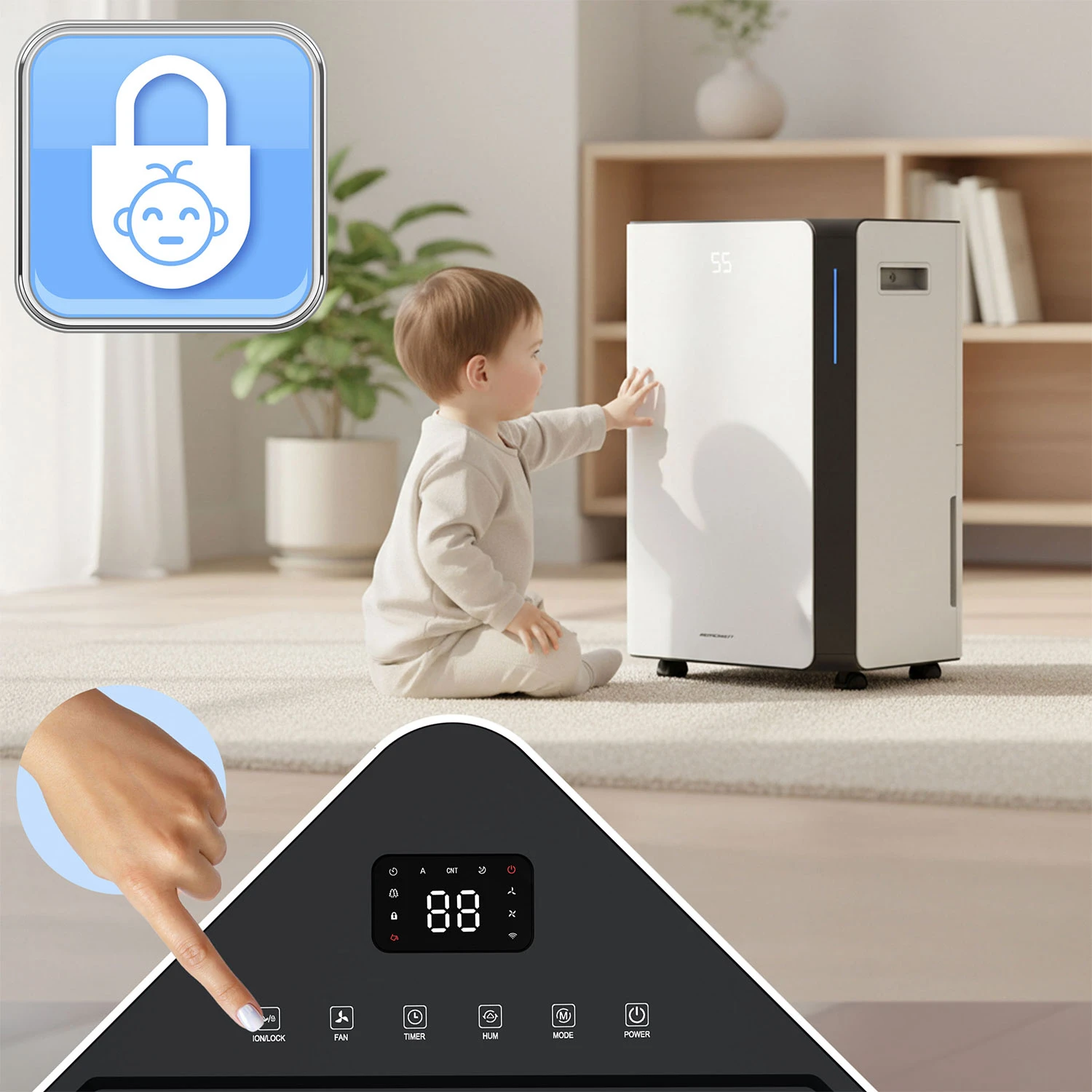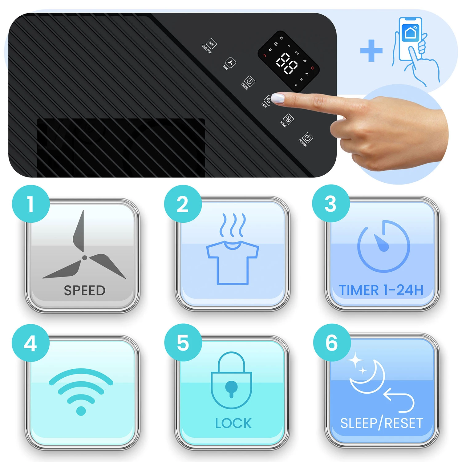 - Taimer 1–24 h – seadista tööaeg ette: lase niiskusekogujal töötada öösel, tööpäeva ajal või kindla ajavahemiku kaupa.